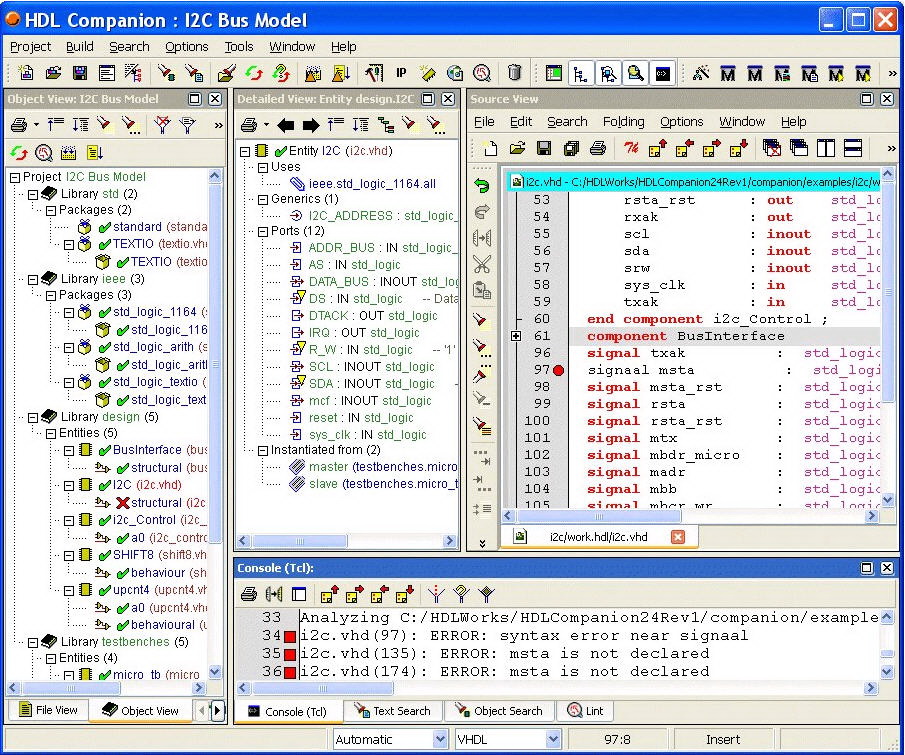 all syntax errors and warnings, which can easily be located in the HDL